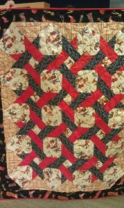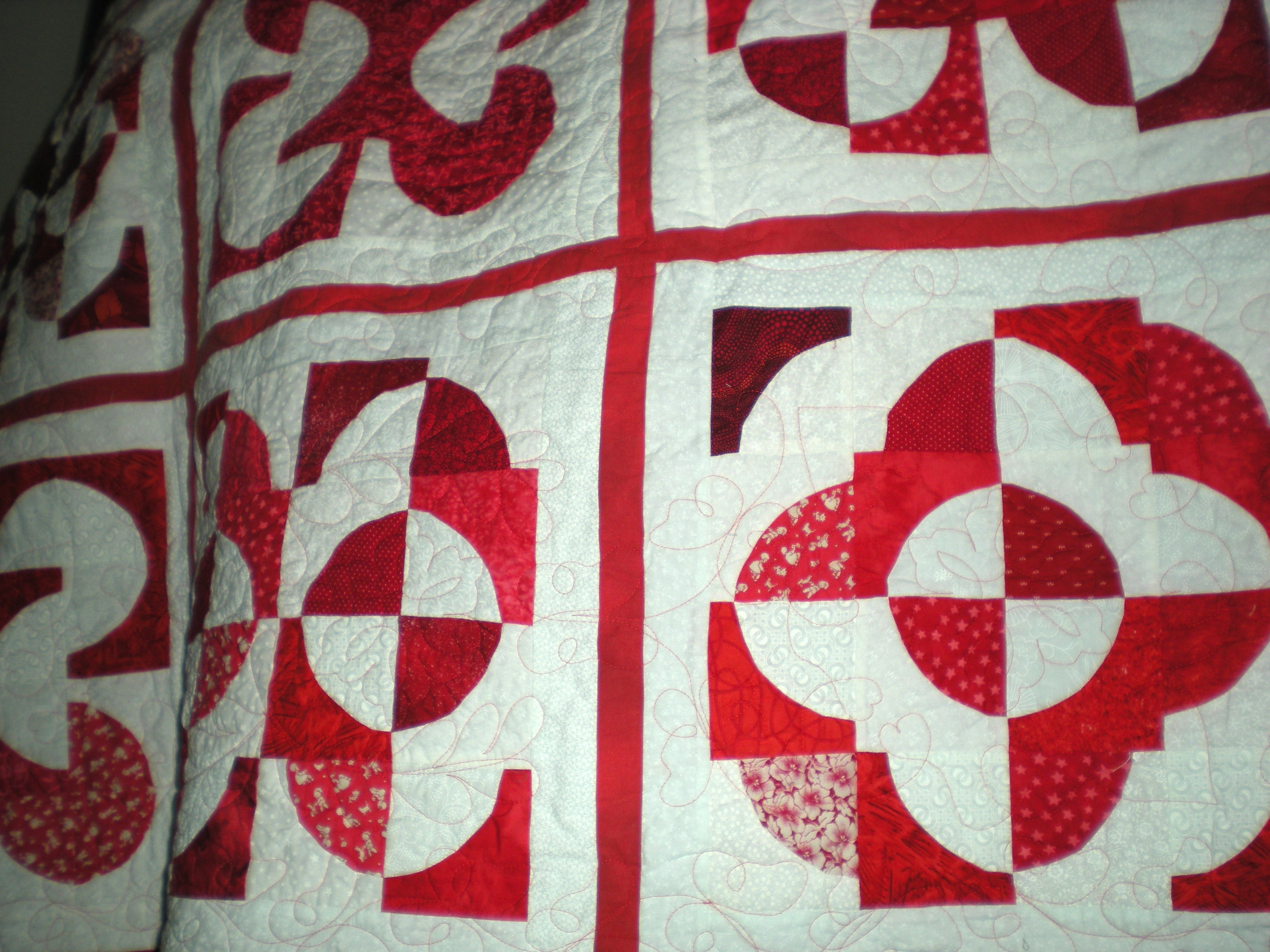 The photos and directions were so easy to follow, that the curves didn’t bother me a bit. I did 4 different squares using 2 templates. A co-worker was practicing on her new long arm and quilted it for me. She apologized because she used a slightly damp cloth to erase the blue marker. Well, as we all know, reds can run (not this redhead but red fabric is very iffy).