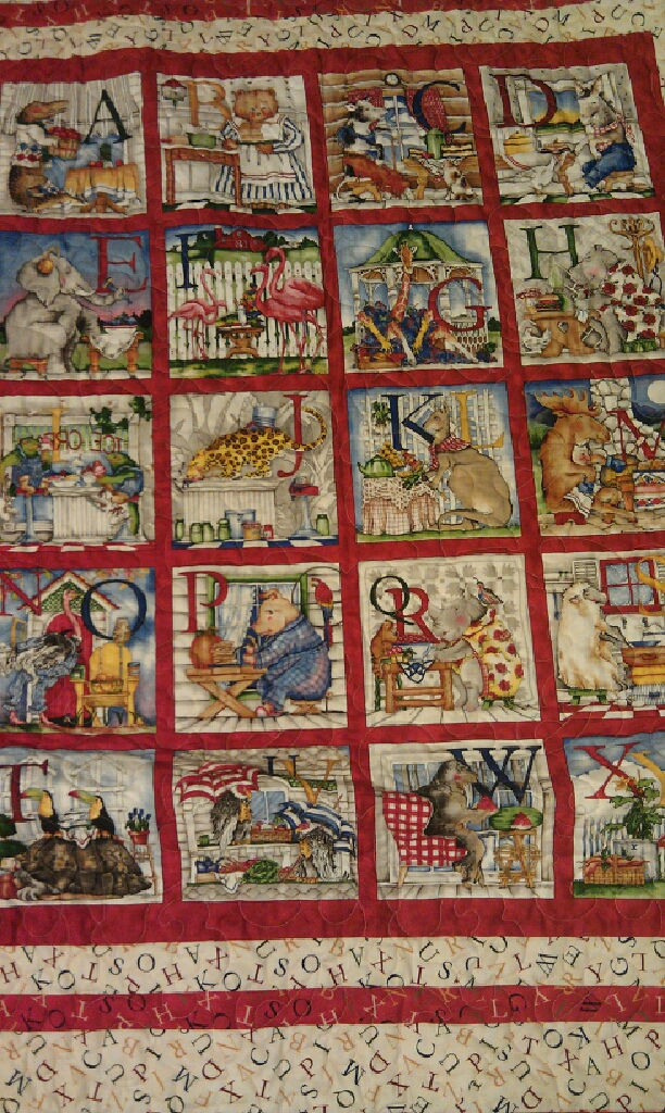 I love this design.  J Frisch takes each letter and does a fabulous job.  The first time I made the quilt, the colors were a bit more subdued with pastels.  Last time, it had a circus theme.